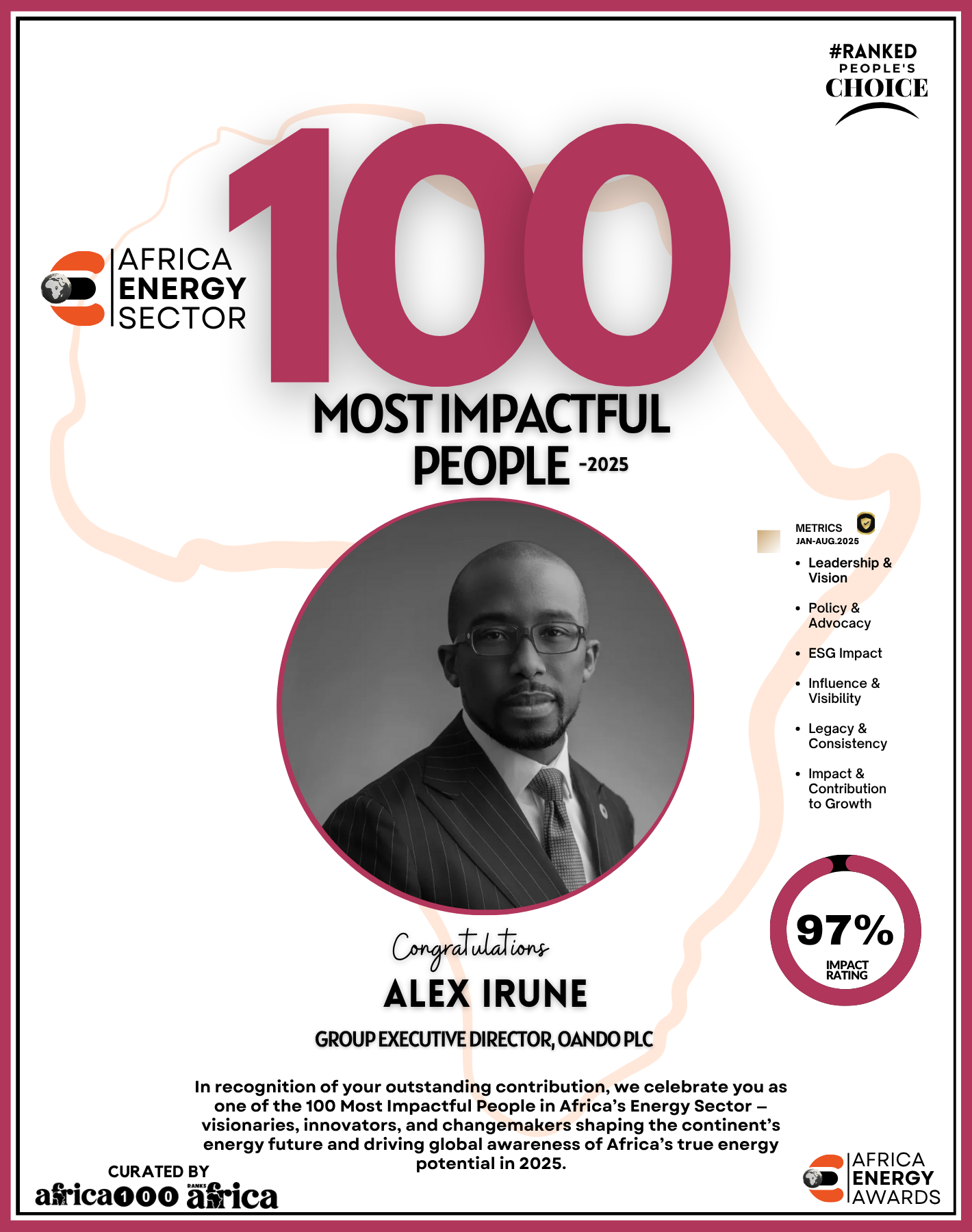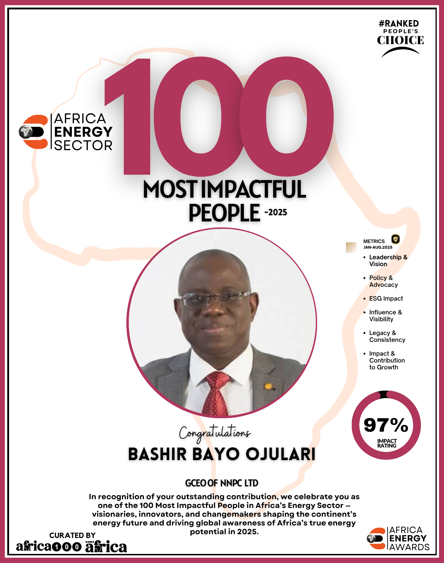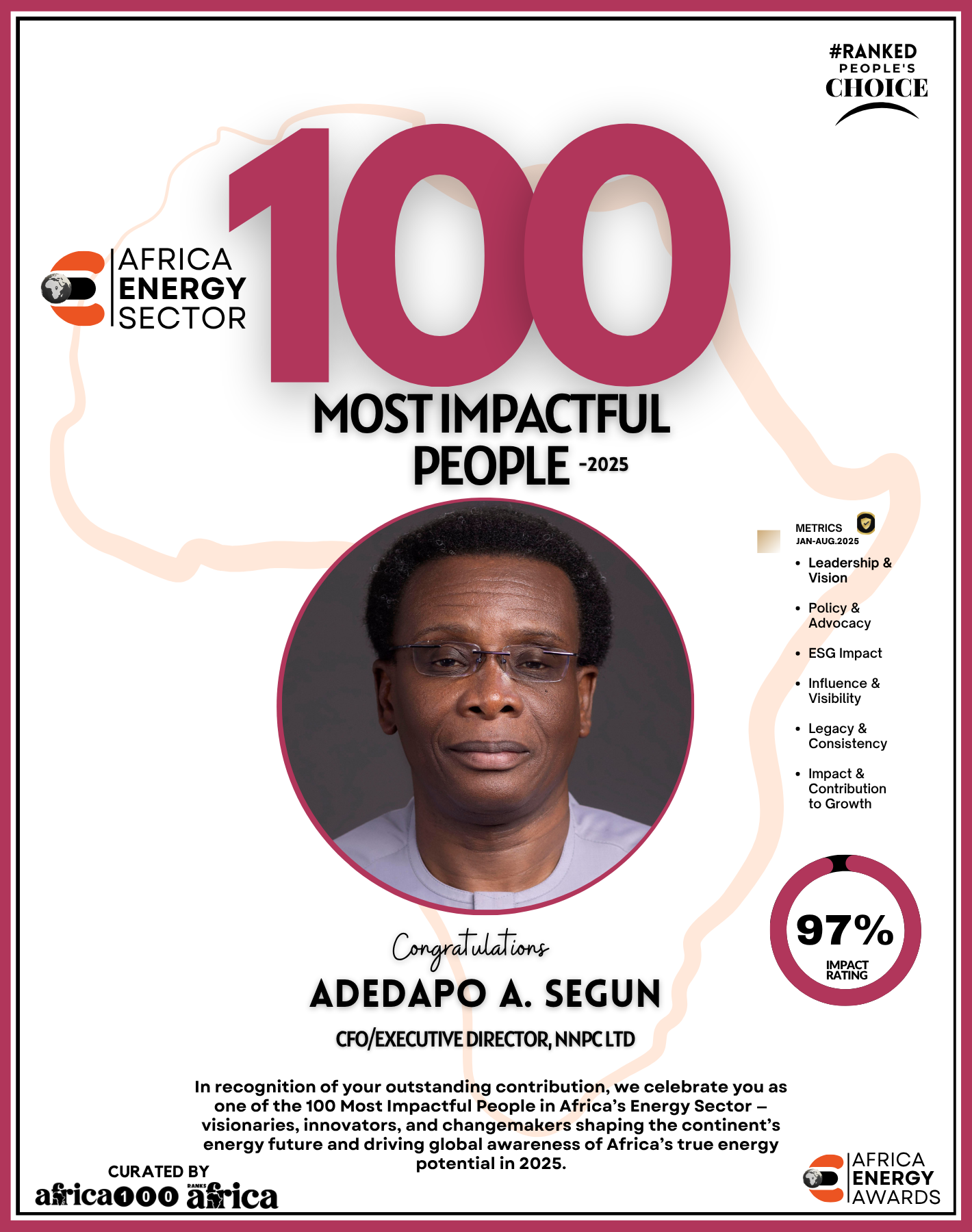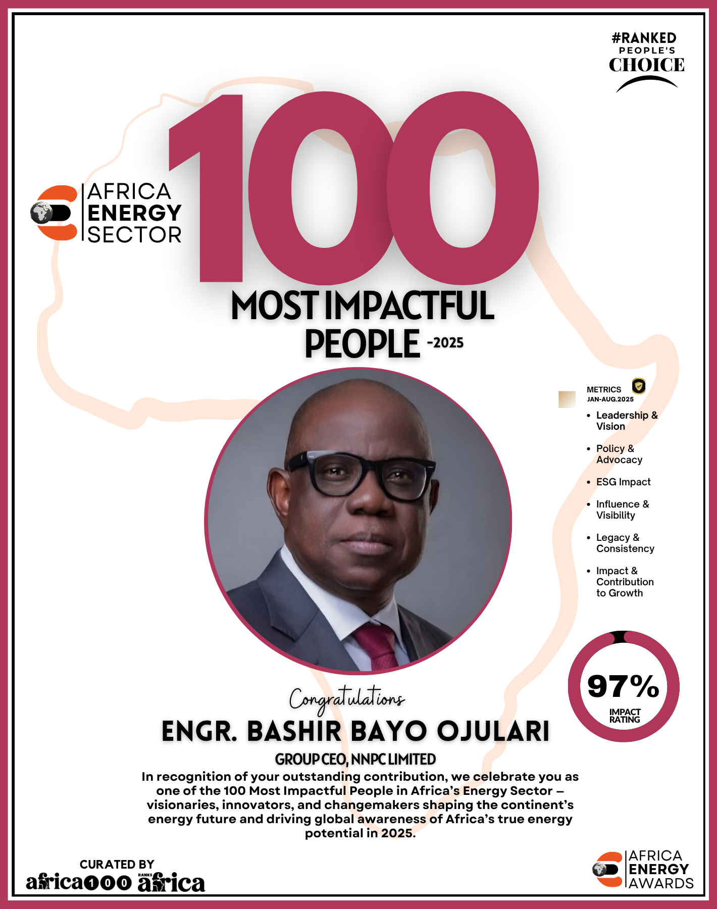 The Energy 100 celebrates a remarkable group of visionaries, trailblazers, and leaders who are redefining how the continent produces, distributes, and consumes energy. From pioneers in oil and gas to champions of renewable energy, clean tech innovators, policy advocates, and daring entrepreneurs bringing light to underserved communities — these individuals are shaping Africa’s energy destiny.